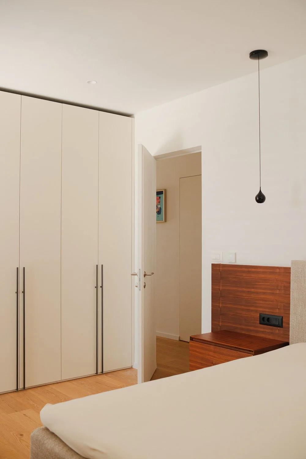 Za vrati v spalnici se razteza umirjena linija garderobnih omar.